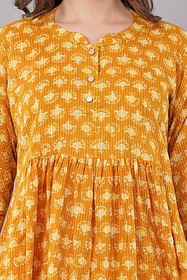 Anarkali Printed Yellow Cotton Kurta / kurti for Women, Knee Length